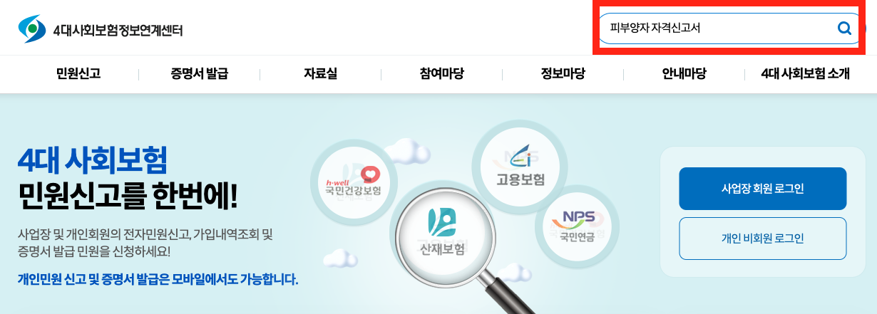 홈페이지에 접속해 검색창에 [피부양자 자격신고서]를 검색해 주면 됩니다.