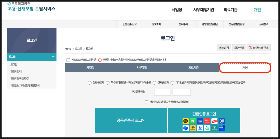 본인이 어떤 근로자인지도 체크 후 로그인을 해야 합니다. 보통은 일반 근로자 유형이 젤 많을 것 같은데요.