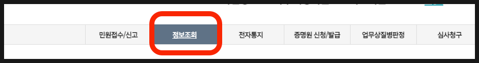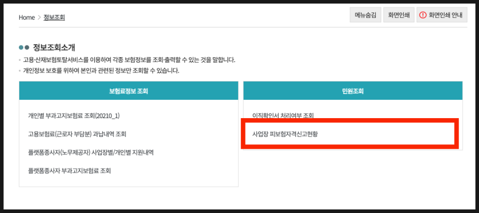 3. 그리고 '[정보 조회]'-'[민원 조회]'-'[사업장 피보험자격신고현황]'을 클릭해 줍니다.