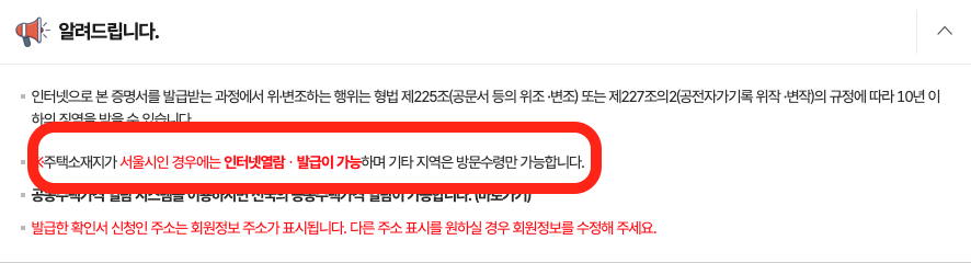 4. 해당 홈페이지의 설명처럼 '서울시의 경우에만 인터넷 열람, 발급이 가능하고 기타 지역은 방문 수령만 가능합니다.