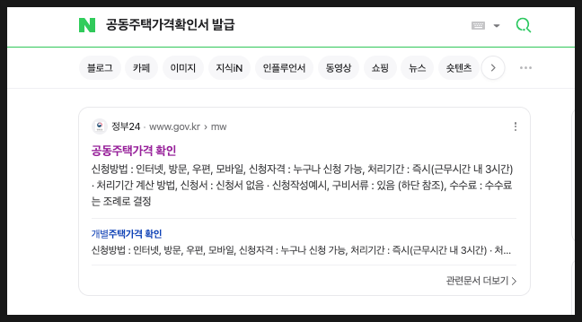 1. 네이버에 [공동주택 가격확인서 발급]을 검색해 아래 정부 24 사이트의 [공동주택 가격 확인]을 클릭해 줍니다.