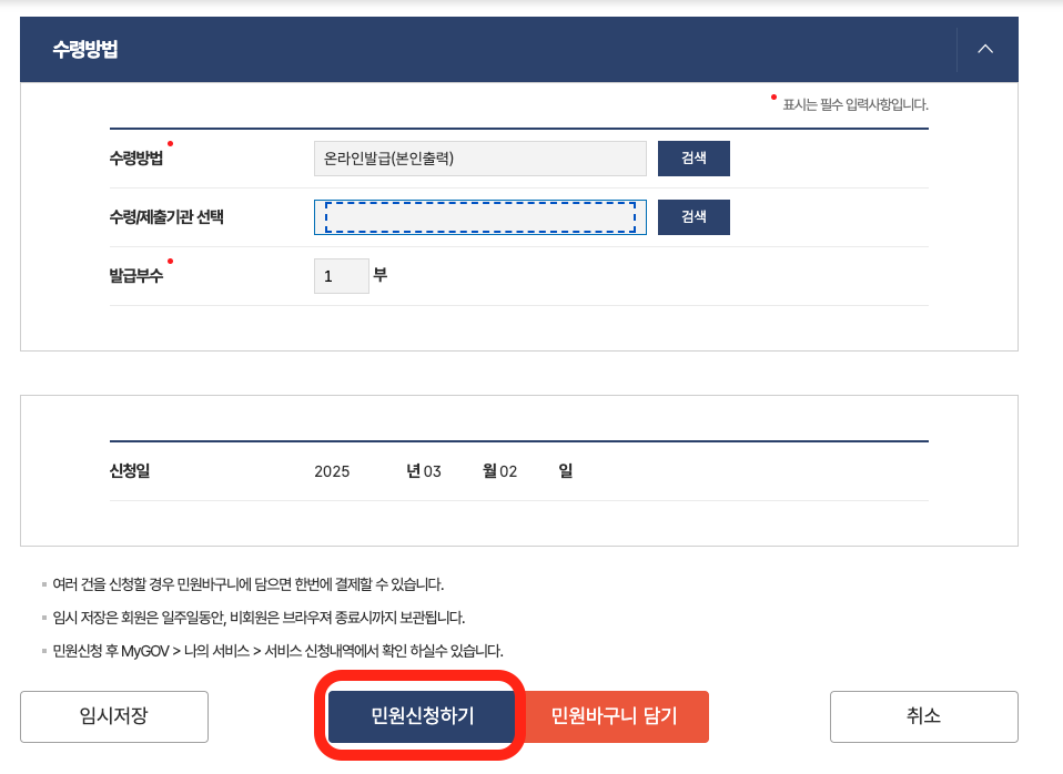 6. 그리고 수령방법을 선택해 하단의 민원 신청하기를 선택해 주면 됩니다.