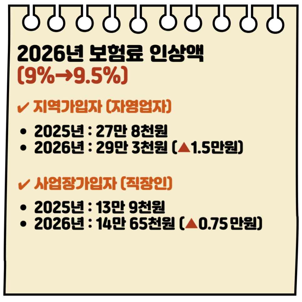 사업장 가입자는 기업이 보험료의 절반을 내주기 때문에 2025년 13.9만 원을 납부하고 2026년이 되면 14.65만 원을 납부해 전년 대비 7,500원을 더 납부하게 됩니다.