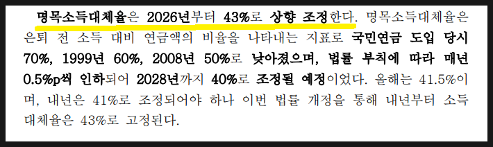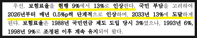 이러한 상황에서 국민연금의 보험료율을 올리고 소득대체율도 올리는 개혁안이 나오게 된 것입니다.