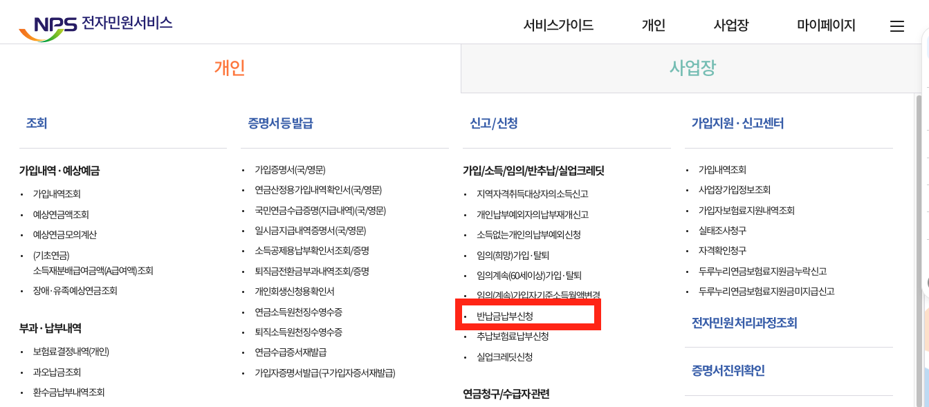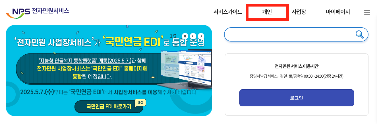 국민연금 전자민원 서비스에 접속해 [개인]을 클릭해 줍니다.
