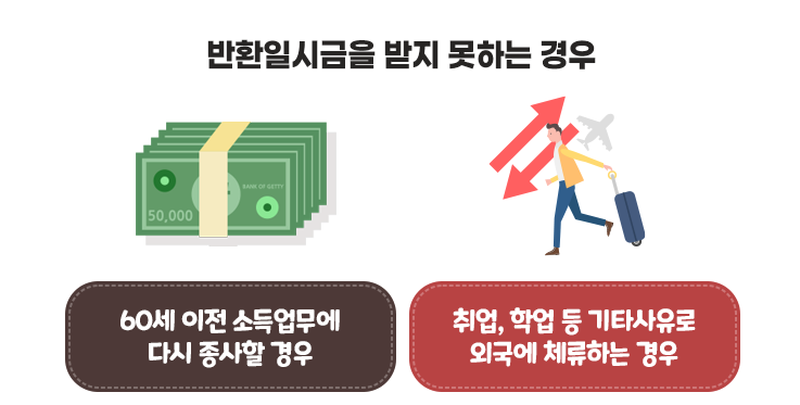 하지만 국민연금 자격을 상실한 사람이더라도 60세 도달 전에 소득이 있는 업무에 종사하게 된다면 다시 가입자가 되기 때문에 반환 일시금을 즉시 수령할 수 없습니다. 또한 국외이주의 목적이 아닌 취업, 학업 등 기타 사유로 외국에 체류하는 경우에도 기간과 상관없이 반환일시금을 지급받을 수 없게 됩니다.