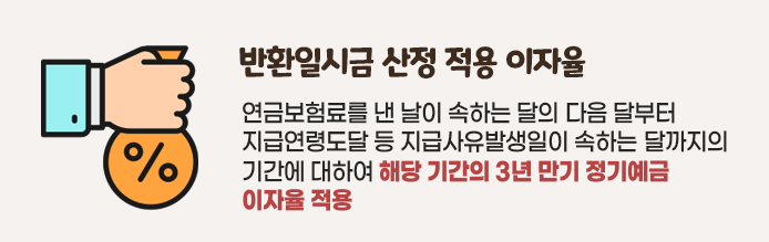 연금보험료를 낸 날이 속하는 달의 다음 달부터 지급연령도달 등 지급사유발생일이 속하는 달까지의 기간에 대하여 해당기간의 3년 만기 정기예금 이자율을 적용시키게 됩니다.