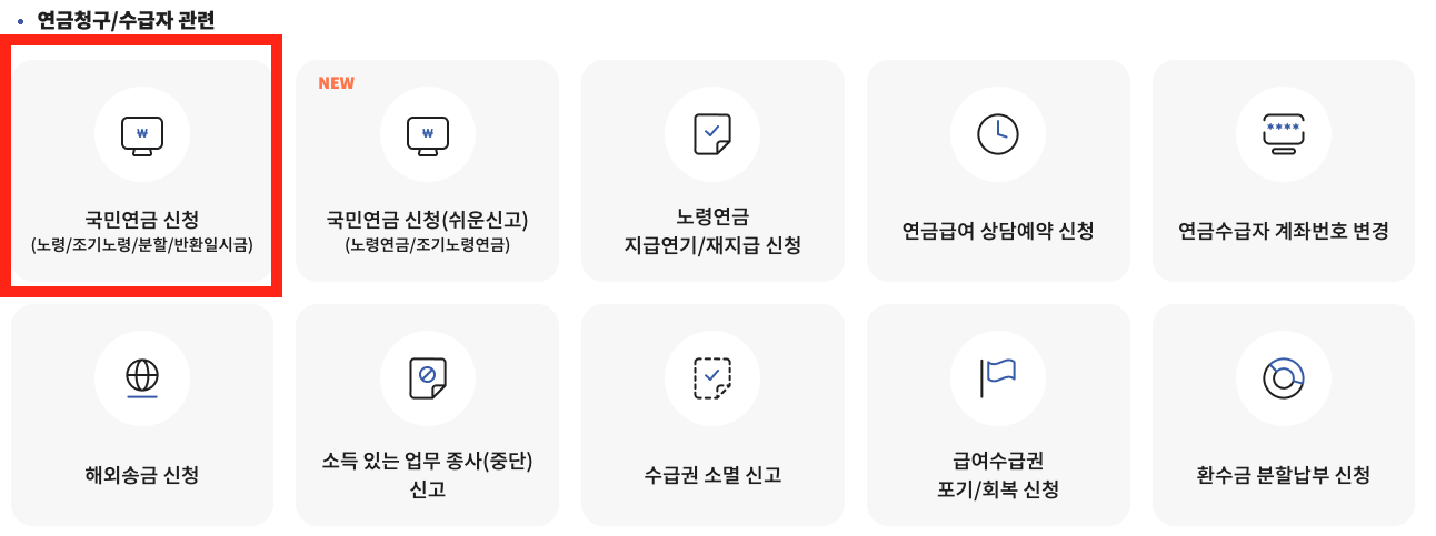 그리고 [연금청구/수급자 관련]한 메뉴에서 [국민연금신청]을 눌러줍니다.