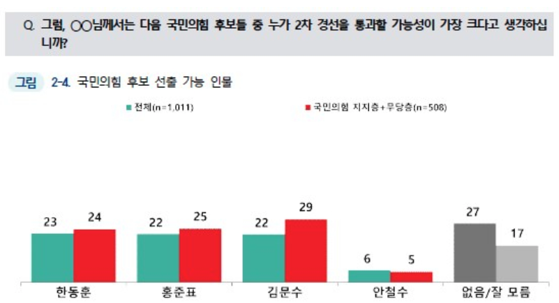 위와 같이 한동훈 후보는 23%였고 김문수후보와 홍준표 후보는 나란히 22%였습니다.