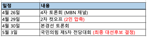 국민의 힘은 4월 27일(일)~4월 28일(월) 2일간 선거인단 투표와 국민여론조사를 진행해 다음날인 29일(화) 최종 경선 진출자 2명을 발표하게 됩니다.