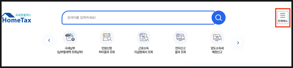 1. 홈택스 홈페이지에 들어가 [전체 메뉴]를 클릭해 줍니다.
