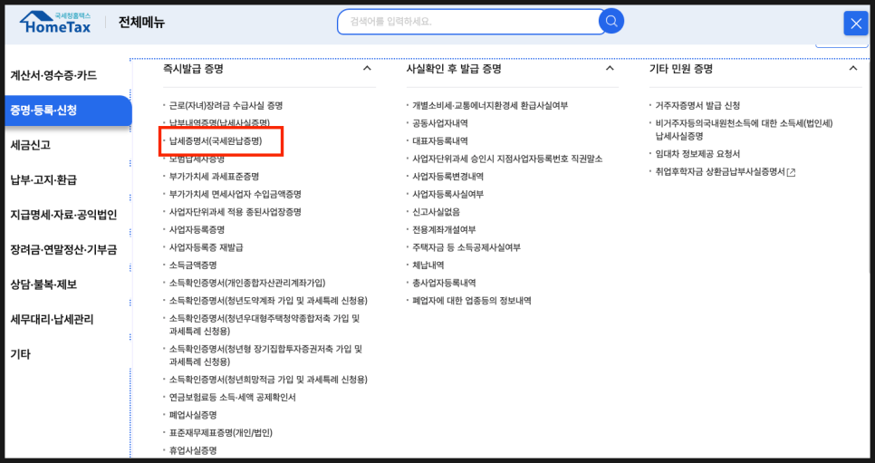 국세 완납 증명서(납세증명서) 발급방법 - 전체 메뉴