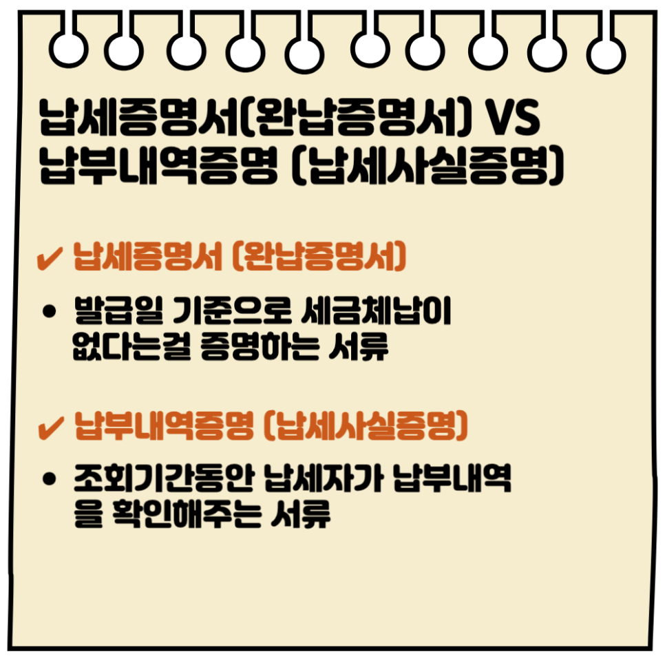 - 납세증명서 (완납 증명서) : 발급일 기준으로 세금 체납이 없다는 것을 인증해 주는 서류