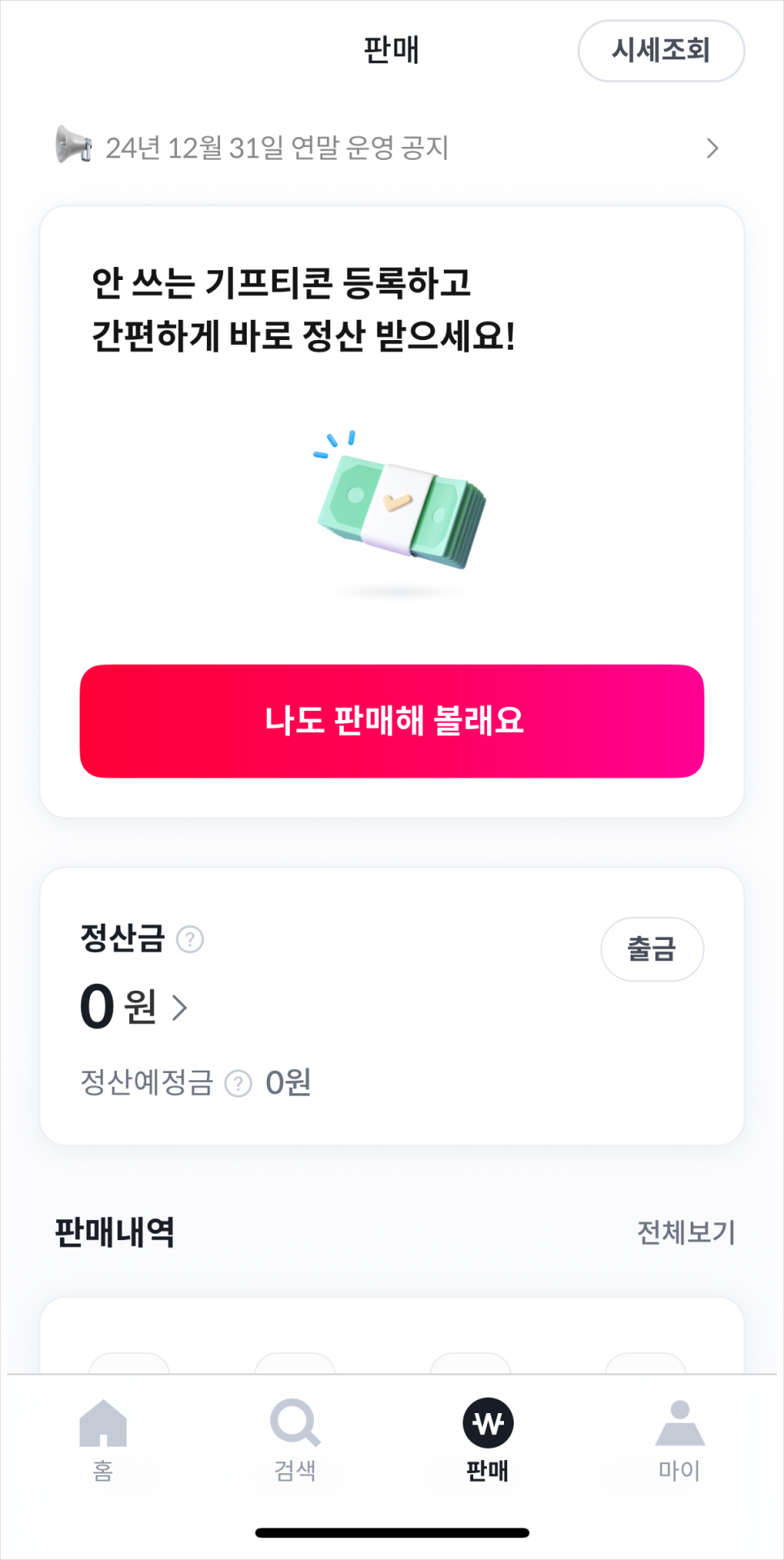 2. 하단에 판매를 클릭한 후 "나도 판매해 볼래요"를 클릭해 앨범에 있는 기프티콘을 업로드하면 됩니다.