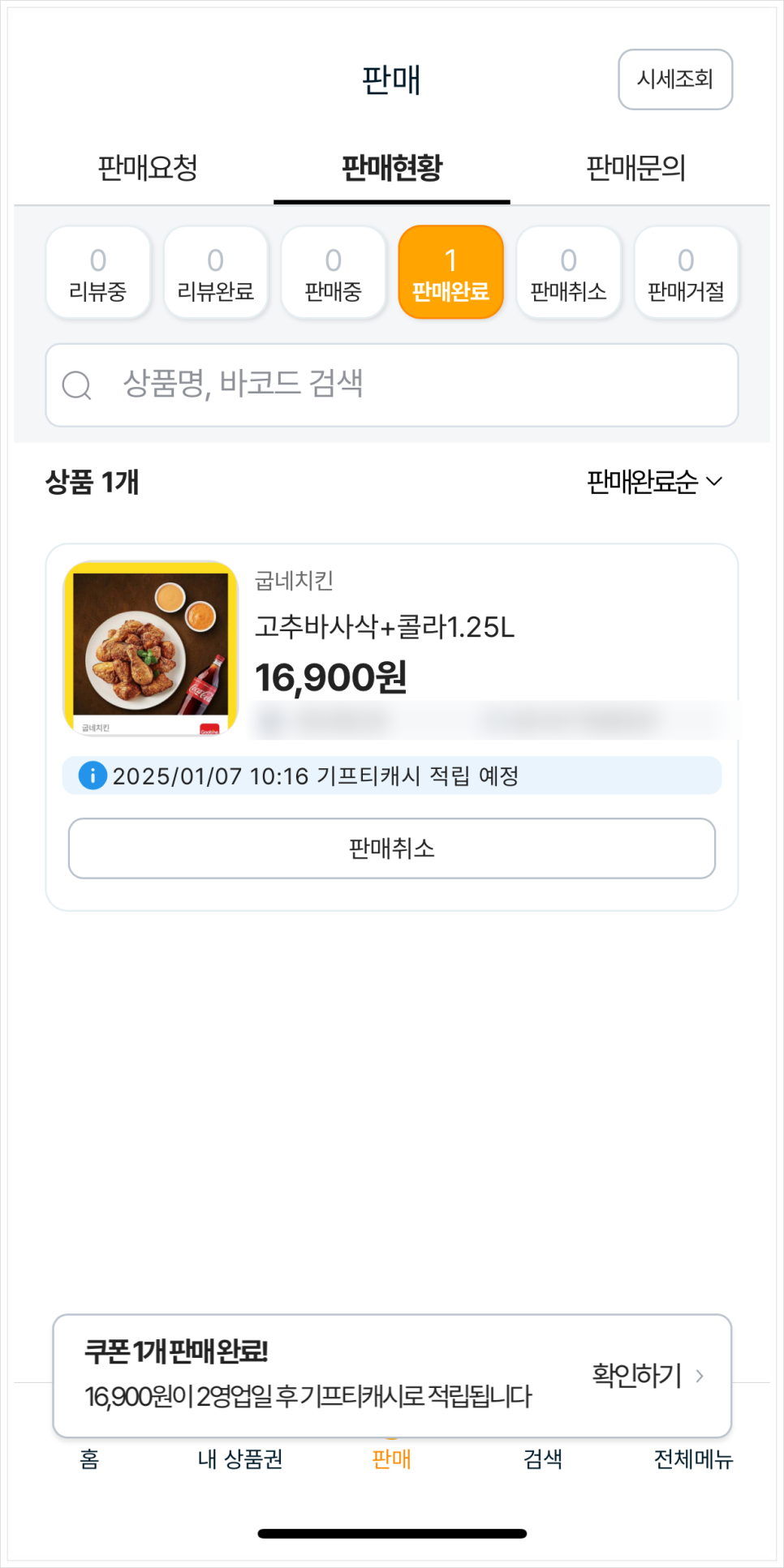판매 완료 후 기프티 캐시 적립 예정 화면