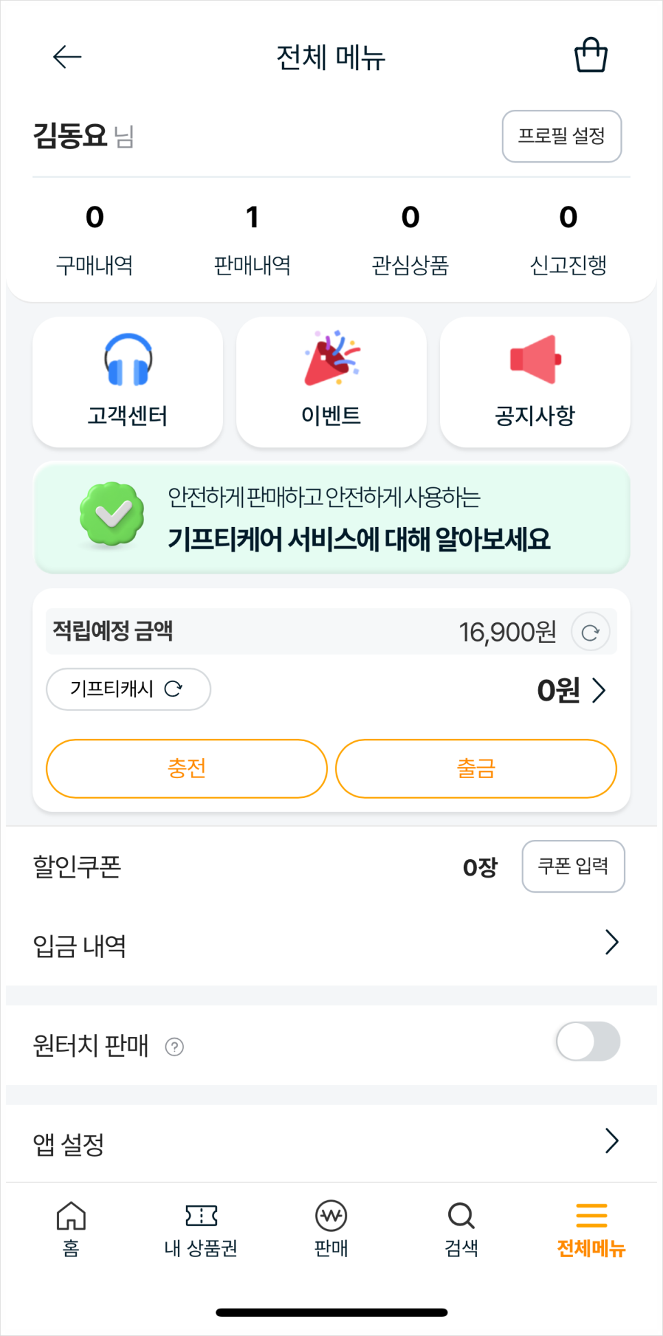 제가 올린 기프티콘 금액은 16,900원이네요.