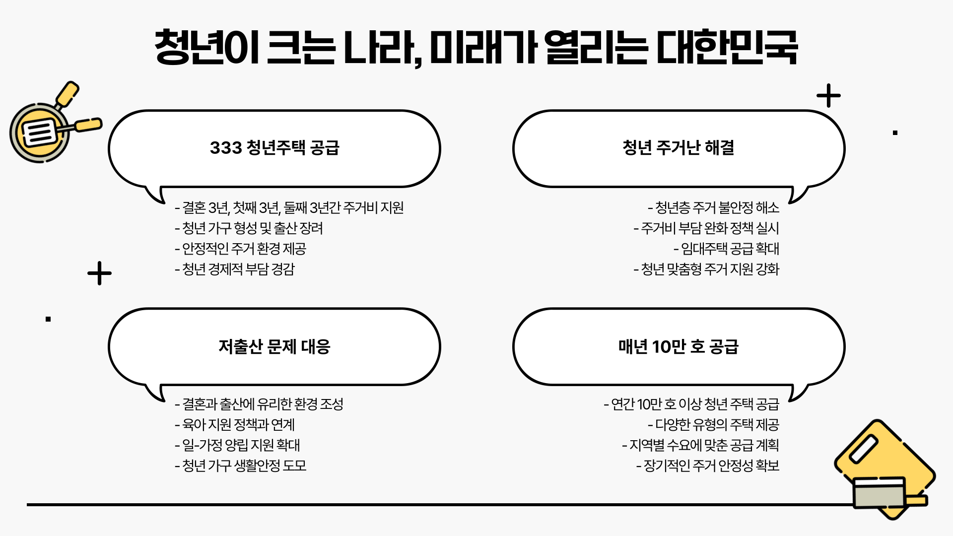 333 청년주택 공급 방안(결혼 3년, 첫째 3년, 둘째 3년간 주거비 지원)으로 청년의 결혼과 출산을 독려하며 매년 10만 호 이상 청년 주택을 공급하겠다고 합니다.