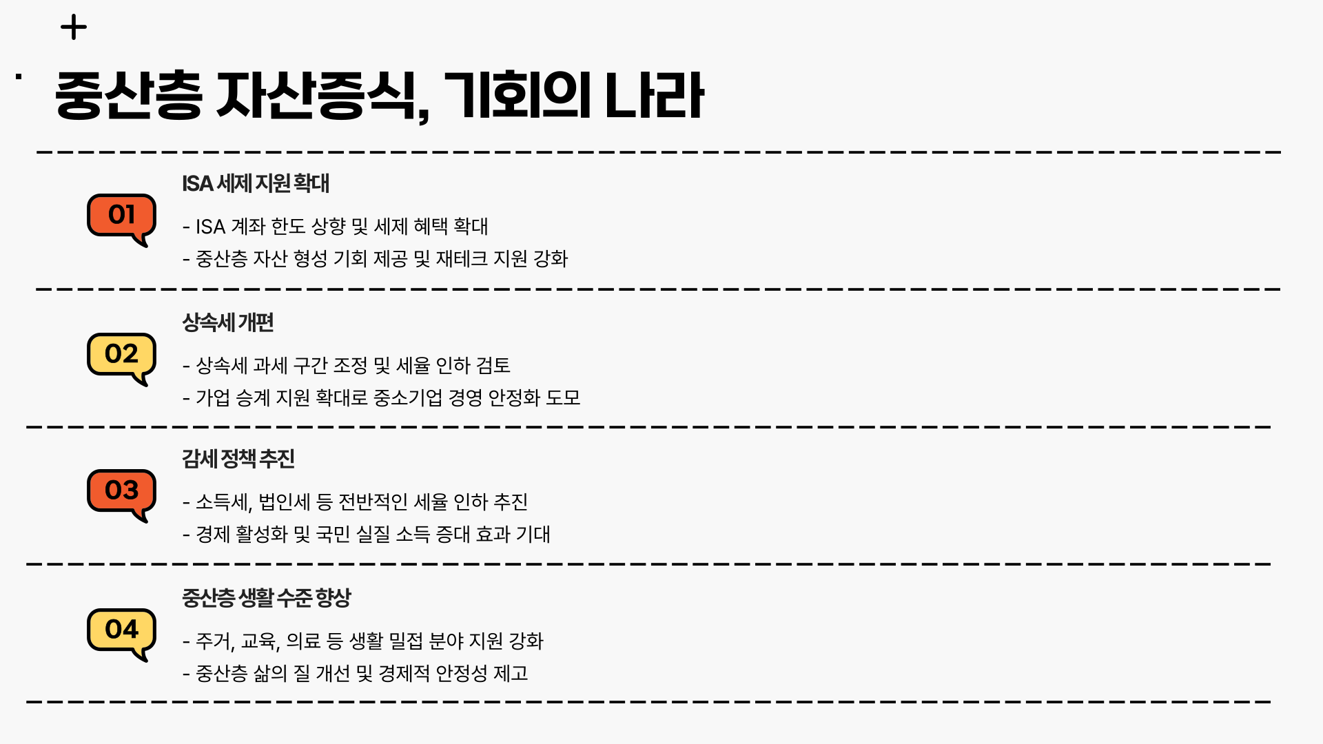 ISA 세제 지원 확대, 상속세 개편, 감세 정책 등 자산 형성 기회를 제공하며 중산층을 국가경제의 주축으로 삼겠다는 구상입니다. 김문수 대선공약은 국민 개개인의 생활 수준 향상을 적극 지원합니다.