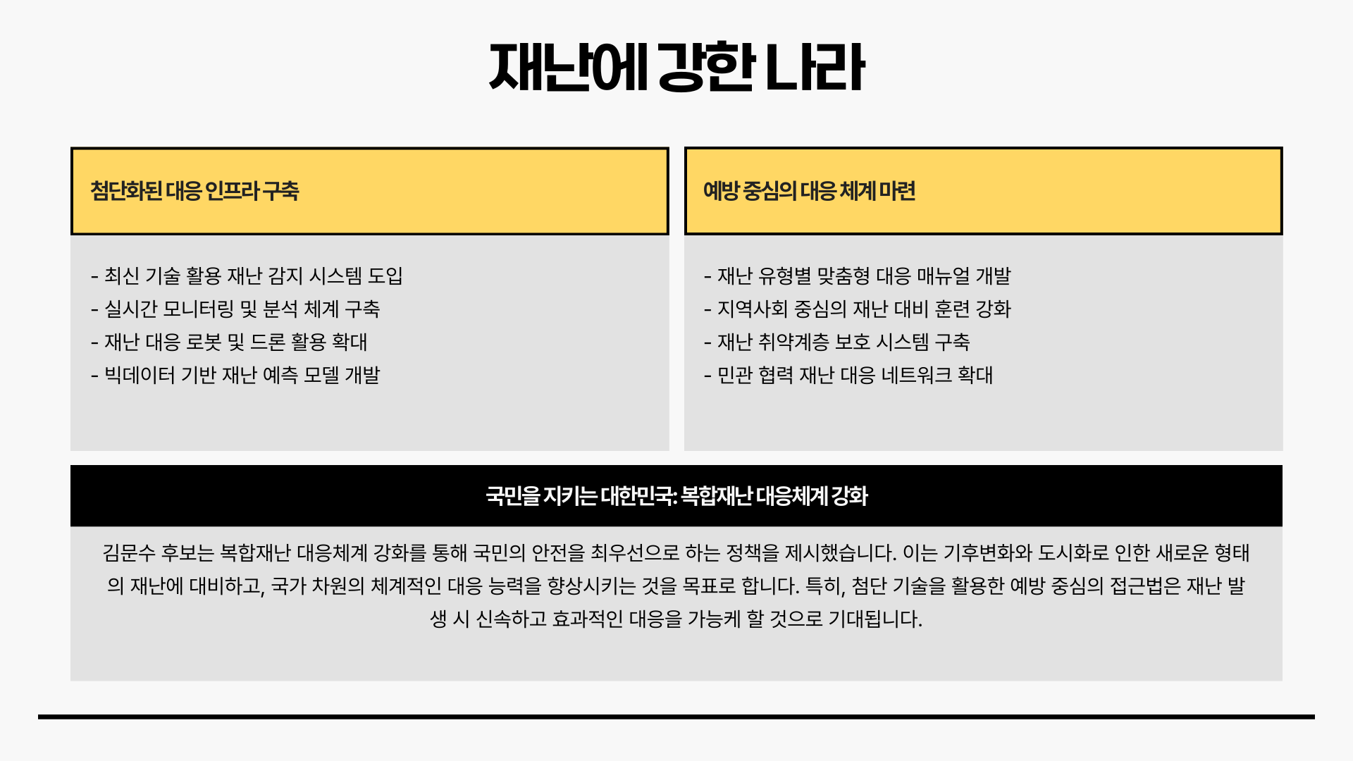 첨단화된 대응 인프라와 예방 중심의 대응 체계를 구축해 국가 재난에 보다 유연하고 체계적으로 대응할 수 있도록 하겠다는 방안이 제시되어 있습니다.