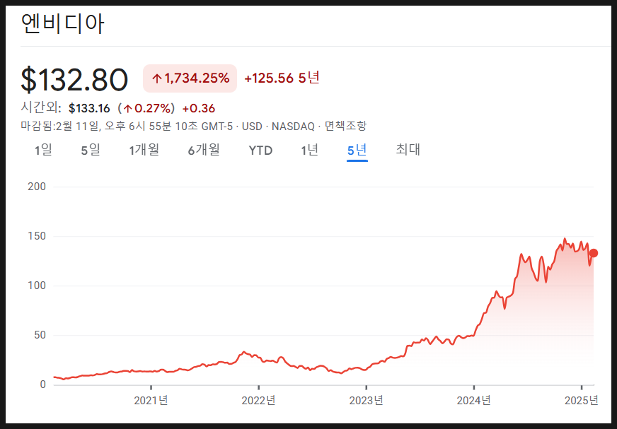 엔비디아는 지난 5년 동안 무려 1734%가 상승하는 놀라운 수익률을 보여주었는데요.
