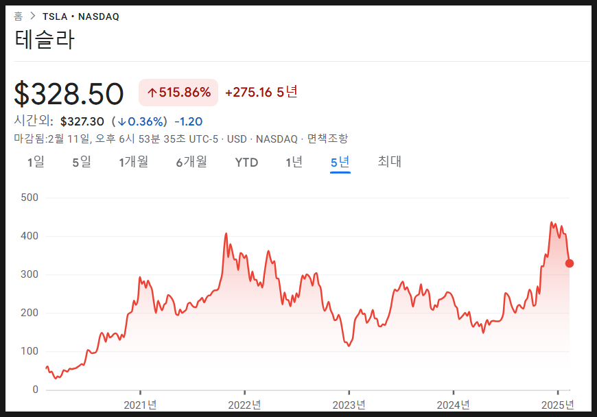 그 외 한국인들이 사랑하는 주식으로 테슬라 역시 지난 5년 동안 약 515%의 주가 상승률을 기록하면서 뜨거운 관심을 받고 있는 주식입니다.