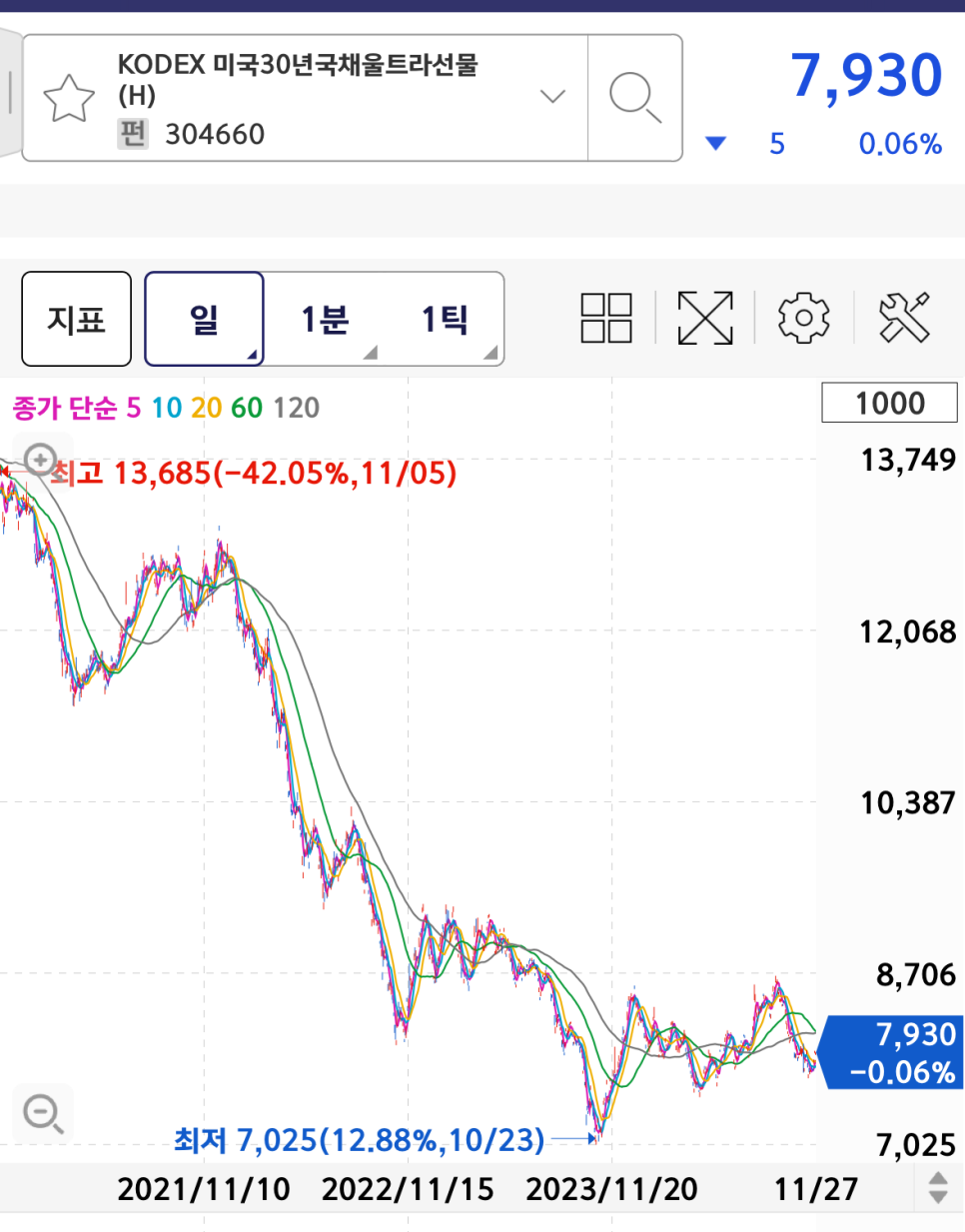 그중에서 한국에서 가장 오래된 미국 장기채 ETF 상품인 삼성자산운용의 Kodex 미국채 울트라 30년 선물 (H)를 검색해 보았는데요.