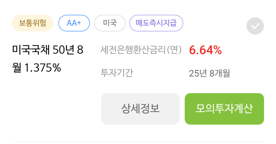 저는 약 미국 국채 50년 만기 상품을 약 2,700만 원 투자한 후 금리가 1% 하락하고 만기 시 환율은 현재보다 약 10% 떨어질 것을 생각해서 모의계산을 돌려봤는데 12% 이상인 약 322만 원 수익을 얻을 것으로 예상되네요.