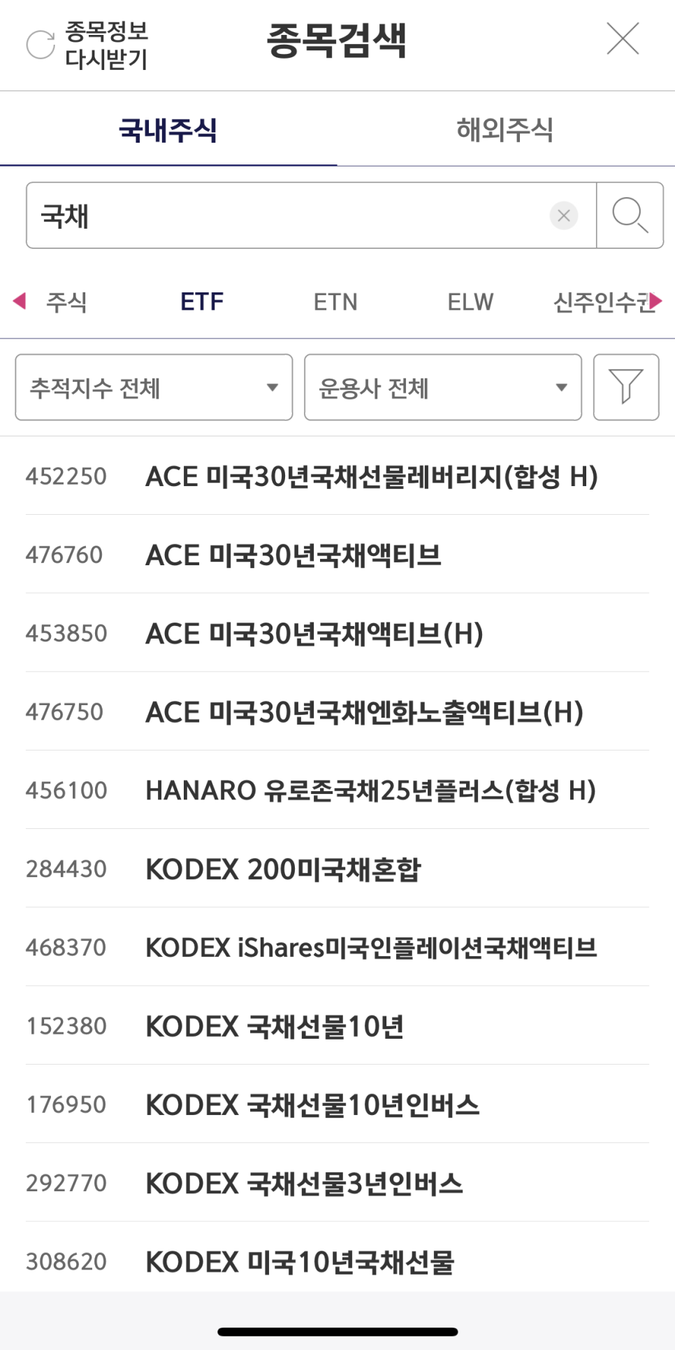 앱 접속 - 종목 검색 -"ETF" 클릭 - "국채"를 입력하면 다양한 만기의 미국 국채 ETF가 검색됩니다.