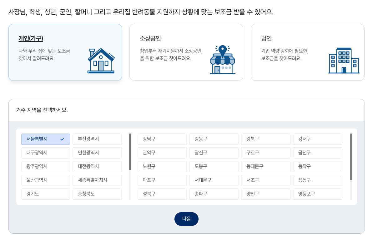 → 전국의 모든 보조금을 한 곳에서 관리할 수 있습니다. - 지역별 혜택까지 한눈에 확인할 수 있습니다