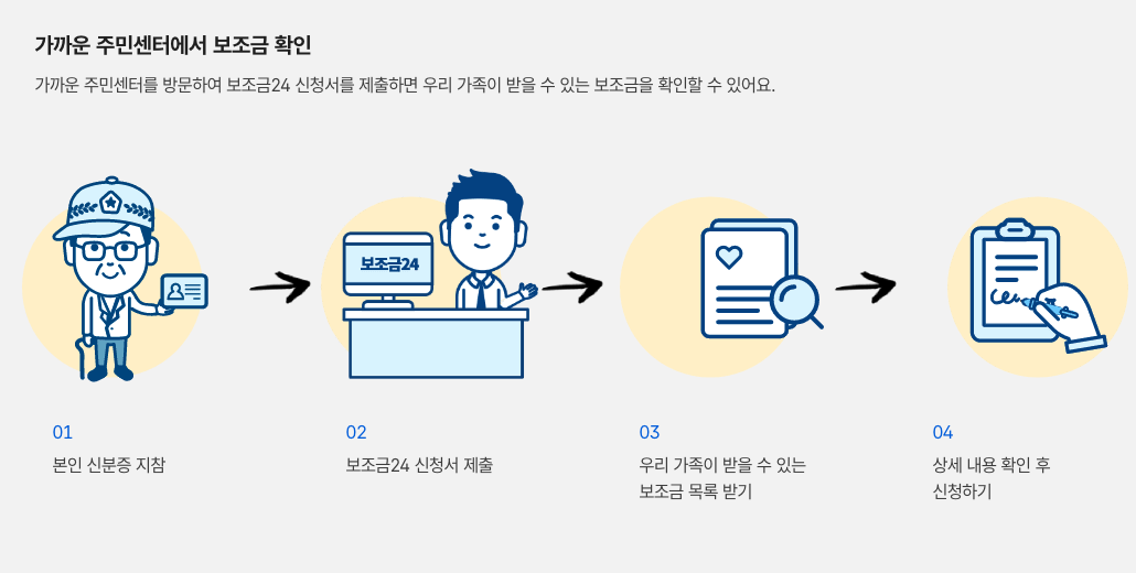 - 본인 신분증 지참 → 보조금24 신청서 제출→ 신청 가능한 보조금목록 받기 → 신청