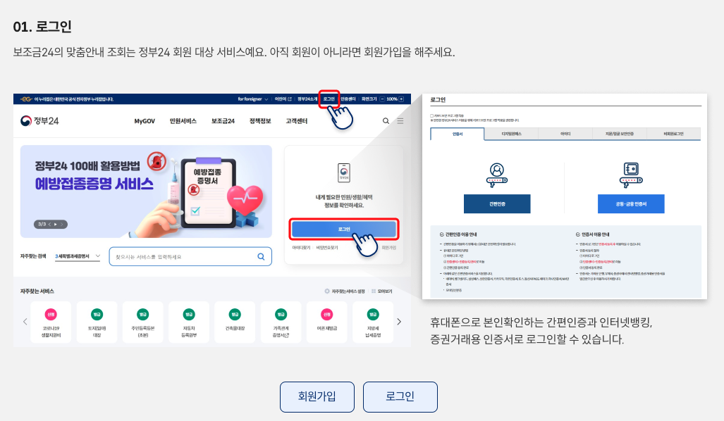 보조금24는 정부 24 홈페이지 또는 앱에서 본인 인증만 하면 바로 이용할 수 있고,