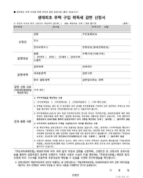 생애 최초 주택 구입 취득세 감면 신청서 양식