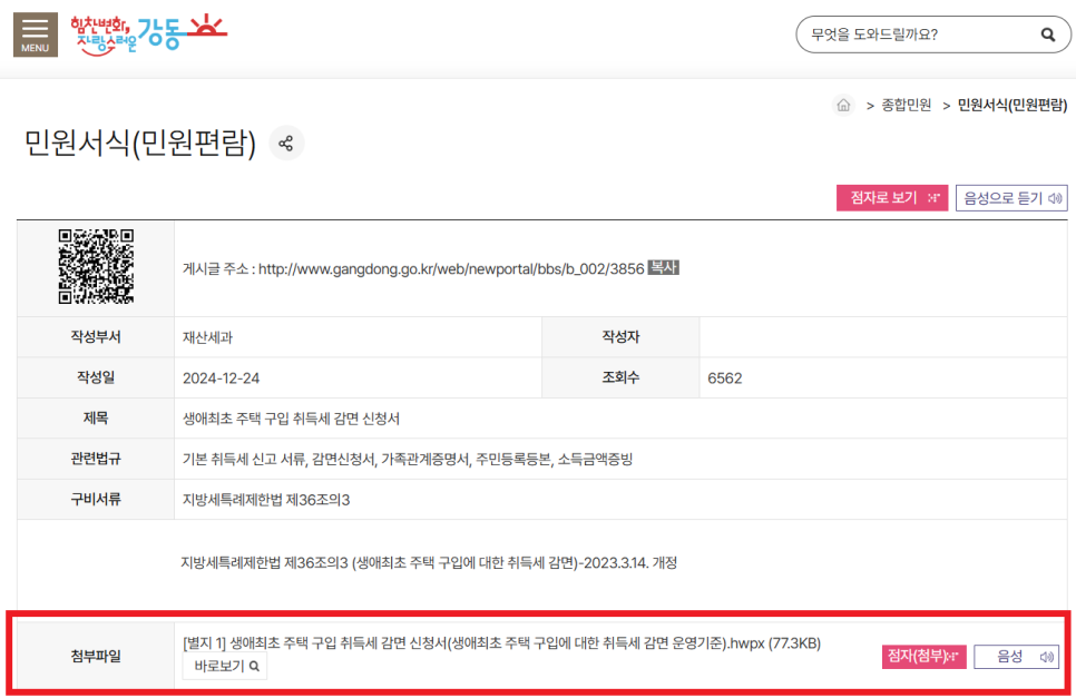 생애 최초 취득세 감면 신청서 양식은 각 구청의 홈페이지에서 확인할 수 있습니다. 위의 홈페이지는 [강동구청 홈페이지]-[민원 서식] 자료에서 확인했습니다.