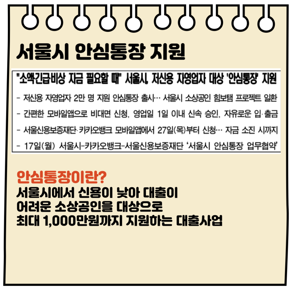 서울시에서는 신용이 낮아 대출이 어려운 소상공인에게 저리로 최대 1,000만 원까지 자금을 지원하는 '안심통장'을 지원하기 시작했습니다.