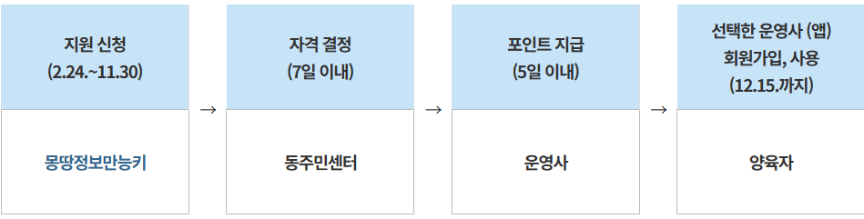 전체적인 절차는 위와 같이 [몽땅 정보 만능키] 홈 페이 지르 통해 신청 후 동주민센터를 통해 자격 확인을 받습니다. 그리고 각 운영사 앱을 통해 회원가입 후 사용해 주면 됩니다.