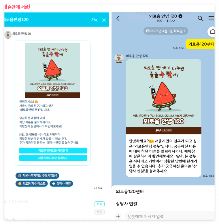 서울시는 전화통화가 어렵거나 전화를 선호하지 않는 시민들을 위해서 [외로움안녕 챗봇]도 같이 운영할 계획입니다.