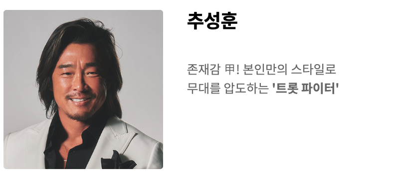 - 추성훈 – 강렬한 존재감을 자랑하는 트롯 파이터.