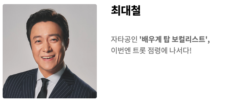 - 최대철 – 배우계의 탑 보컬리스트로 트롯 무대를 점령하고자 함.