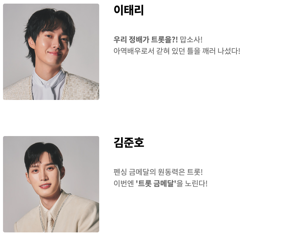 - 김준호 – 펜싱 금메달의 경험을 트롯 금메달에 도전하는 인물.