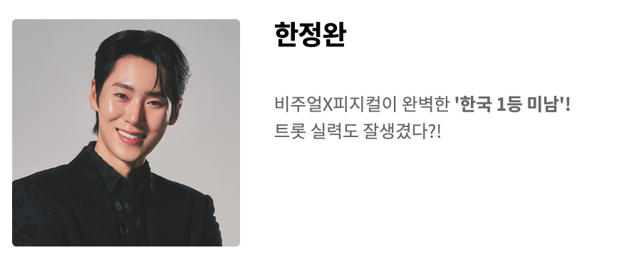 - 한정완 – 완벽한 비주얼과 피지컬을 가진 한국 1등 미남, 트롯 실력도 뛰어남.