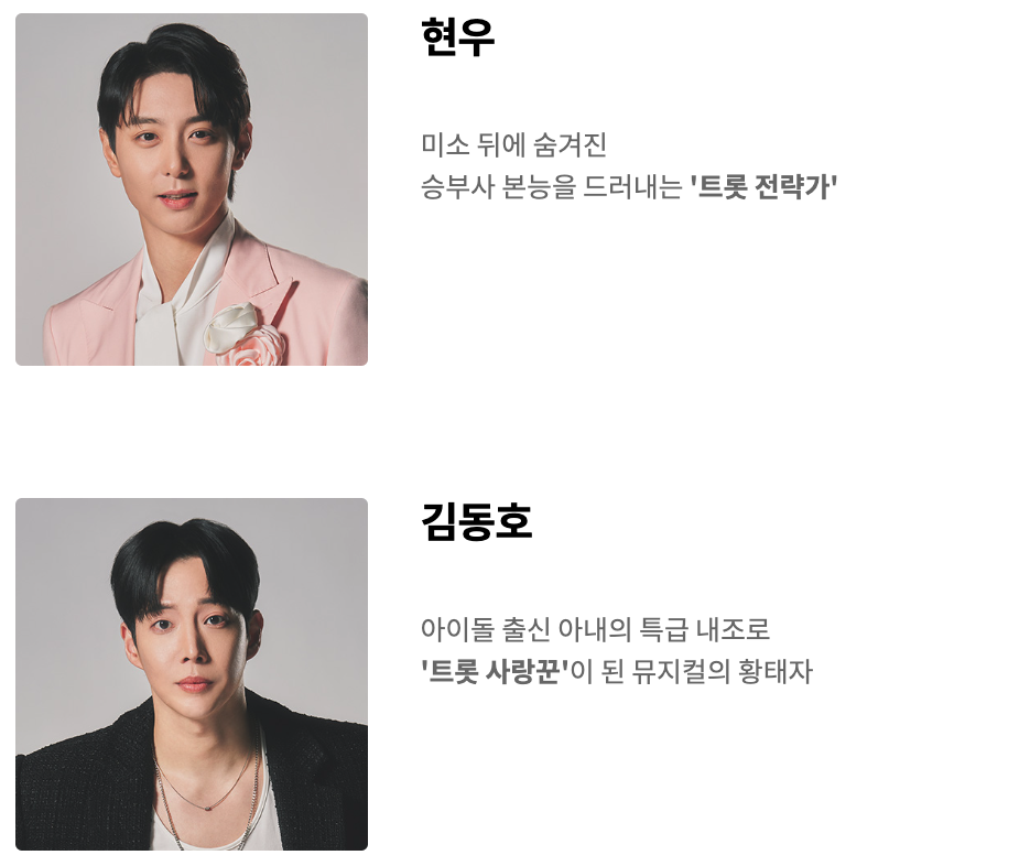 - 김동호 – 아이돌 출신 아내의 지원을 받는 트롯 사랑꾼.