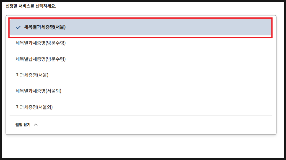 오늘은 세목별 과세 증명서를 알아보기 위한 포스팅이기 때문에 [세목별 과세 증명서]를 클릭해 줍니다.