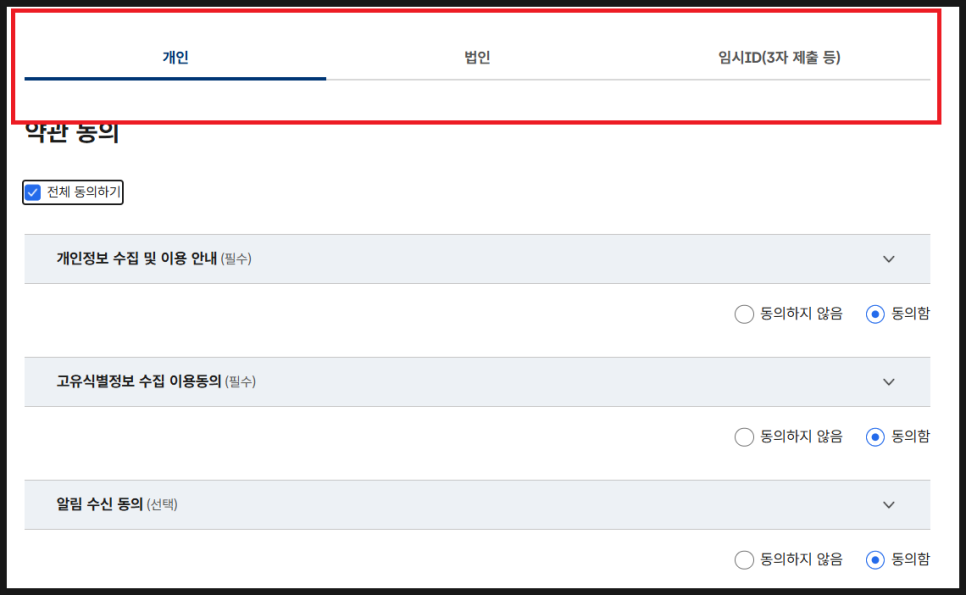 3. 개인과 법인 그리고 3자 제출 중 어떤 유형인지 선택 후 로그인을 해줍니다.