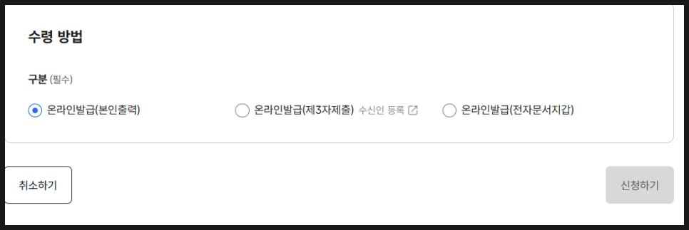 7. 그리고 수령방법을 선택한 후 하단의 신청하기를 눌러주면 됩니다.