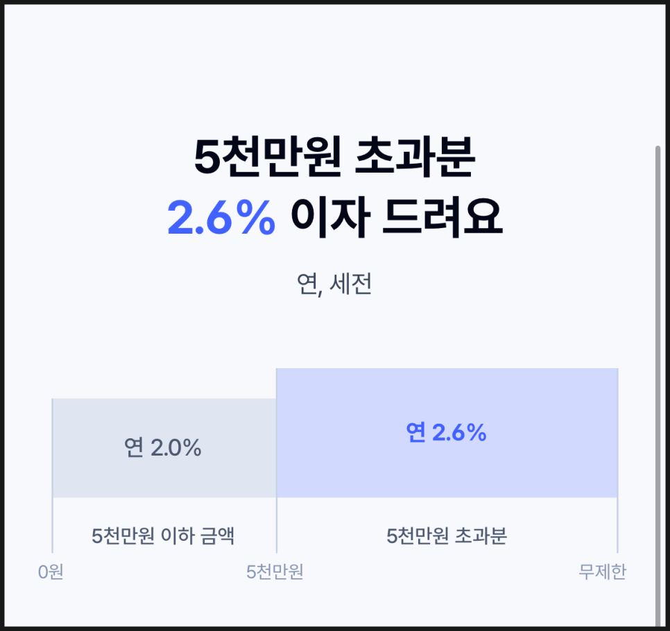 📌 6,000만 원 : 5천만 원까지는 연 2%의 금리를 적용받고 초과 금액인 1천만 원은 2.6%의 금리를 적용받기 때문에 구간별 금리 차이가 발생하는데요.