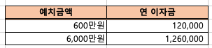 케이뱅크 플러스 박스에 실제로 예치금액을 600만 원과 6,000만 원을 넣어둔다면 연 이자금액은 얼마나 될까요?