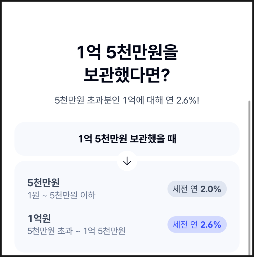- (5천만 원 초과분인) 1억 원은 연 2.6%의 금리 적용