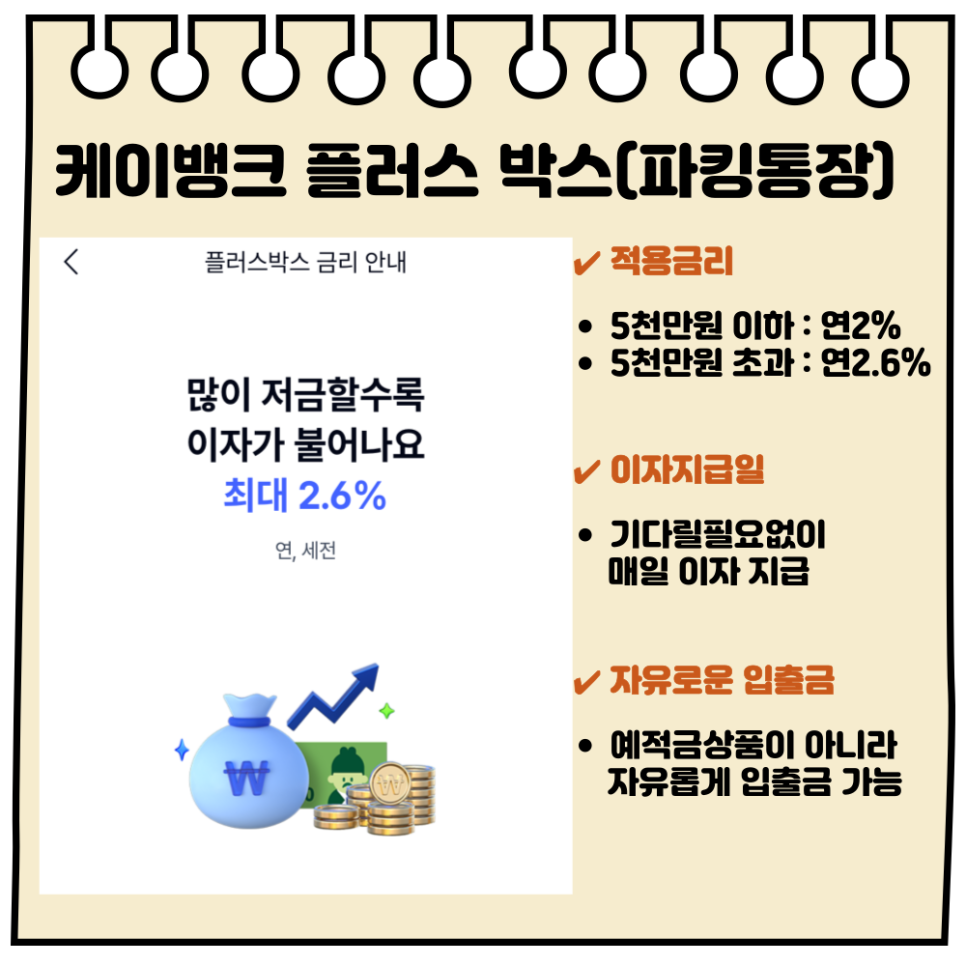 케이뱅크의 플러스 박스 상품은 구간별 최대 2.6%의 세전 금리를 적용시켜주는 파킹 통장 상품입니다.