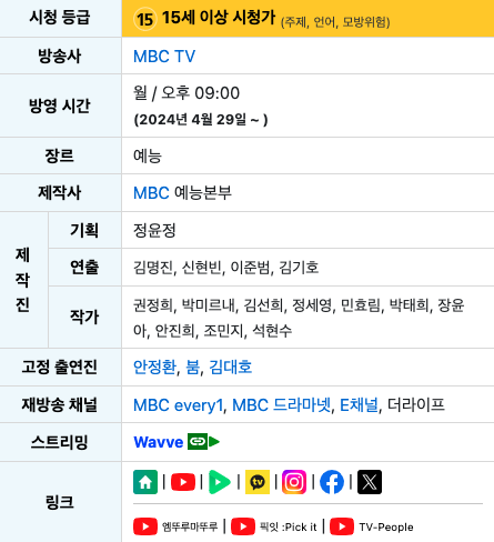 매주 월요일 오후 9시에 MBC에서 방송되고 있으며 현재 출연진으로는 안정환과 붐, 김대호가 나오고 있습니다.