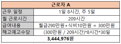 해고 예고수당 = (300만 원 ÷ 209시간) X 8시간 X 30일 = 3,444,976원